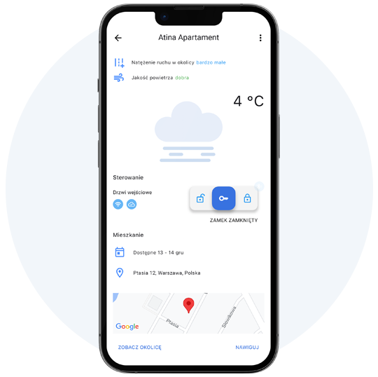 Inteligentny zamek, który zmienia sposób zarządzania dostępem do apartamentu. Dzięki zaawansowanej technologii i aplikacji ATINA,  pozwala właścicielom nieruchomości na zdalne blokowanie i odblokowywanie drzwi.